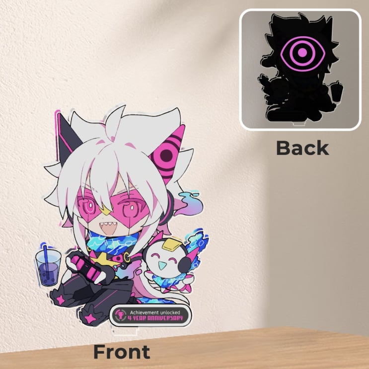 x1: 2pc standee set with 4inch (100mm) double-sided chibi art and separate base attachment
